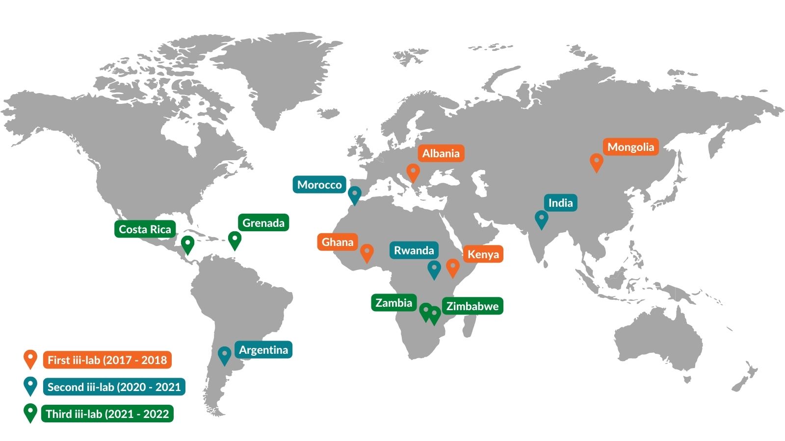A map highlighting the countries that have participated in iii-labs so far.
